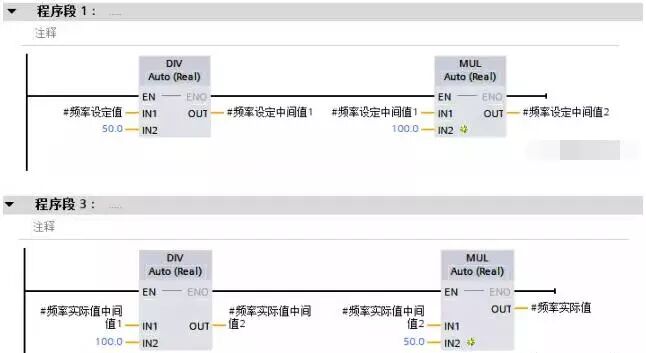 由于程序块中输入管脚“SPEED_SP”与输出管脚“SPEED”所代表的频率值均为最大频率(P1082)百分比,这里我在“USS_DRV”程序块前后做了换算: