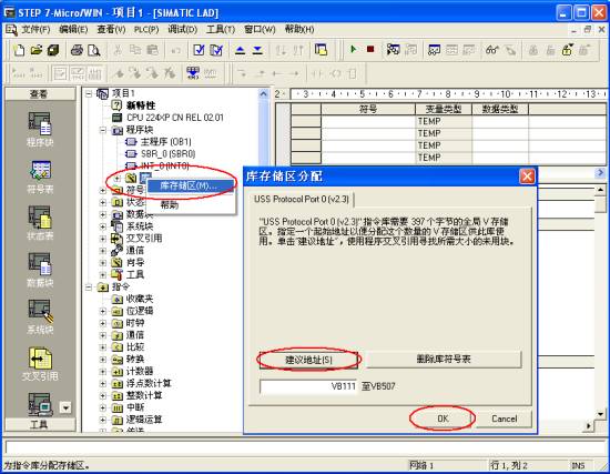 3.7 库存储区分配:在编译程序之前,选择 “程序块” ->“ 库” 右键,选择“库存储区”。在点击 “建议地址” 选择V存储区的地址后点击 “OK”退出。
