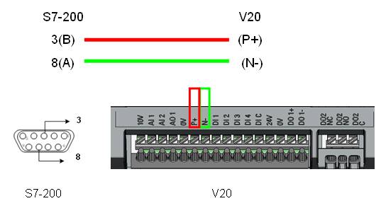 3.3 用电缆将S7-200 Port 0端口与V20的RS485接口相连(注意端口连接规则:V20的 P+对3、N-对8),如下图所示:
