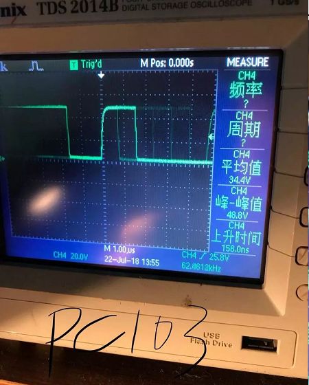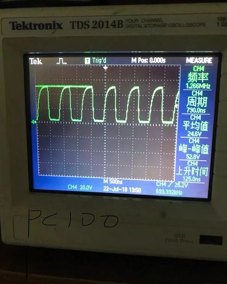 “NLP”意为无主电源故障,母线电压和三相输入电压为无法测量。在参数中屏蔽掉三相输入检测功能后仍然显示“NLP”测量母线电压检测后的取样电压正常(2.96V),说明母线电压检测电路工作正常,随即测量马达控制板的3个通讯光耦工作状态,发现光耦PC100的第6脚为高电平5V,说明此光耦工作状态异常,测量IC105第2脚的电压正常(1.3V)代换光耦PC100,故障排除。以下是马达控制板3个通讯光耦在静态状态下的正常波形: