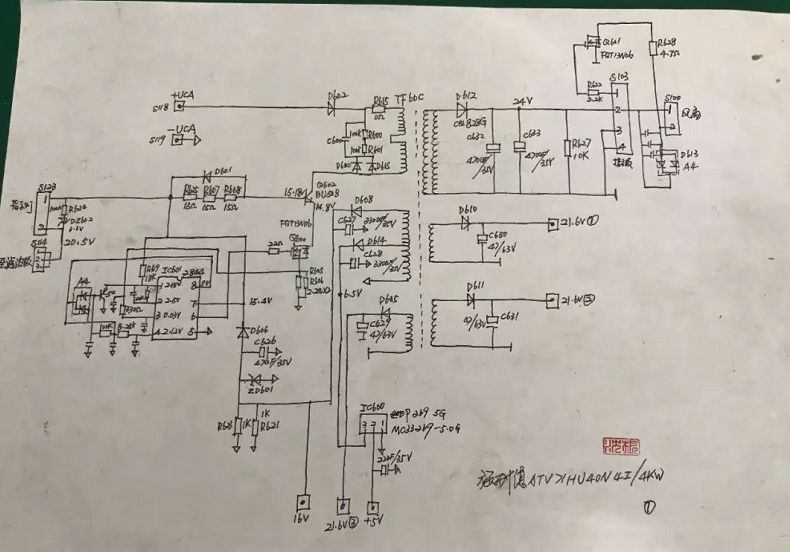 3:稳压电路,首先是由D608 C627整流滤波产生16V电压,这电压就作为稳压取样电压,经过D606 R619 R618分压后加至TL2844第1脚和2脚,1脚是内部误差放大器的输出端,2脚是反馈电压输入端,这时电压与其内部误差放大器同相端的2.5V基准电压进行比较,产生误差电压,从而控制6脚输出的脉冲宽度,以至达到稳压作用。