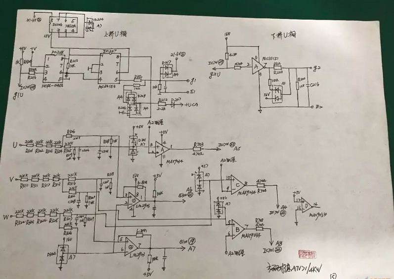 IGBT驱动电路,以W相为例,上桥驱动电路由PC202,IC201 IC200组成,驱动脉冲由IC701第37脚输出,经PC202隔离,放大后由其6脚输出,经IC201第5脚输出脉冲信号。