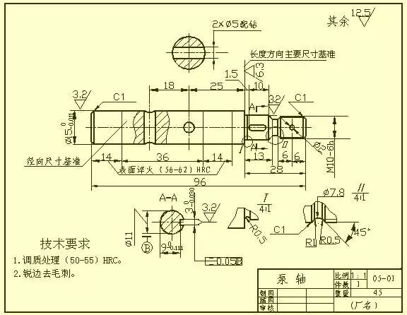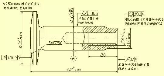一根气门阀杆,在图中所标注的形位公差附近添加的文字,只是为了给读者作说明而重复写上的,在实际的图样中不需要重复注写。