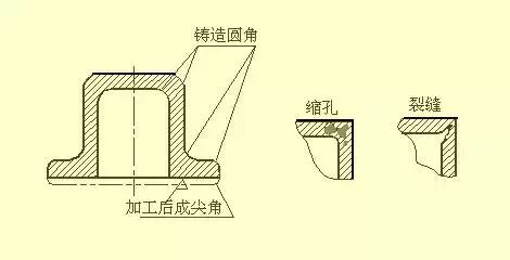 当零件的毛坯为铸件时,因铸造工艺的要求,铸件各表面相交的转角处都应做成圆角。铸造圆角