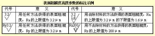 表面粗糙度高度参数Ra、Rz、Ry在代号中用数值标注时,除参数代号Ra可省略外,其余在参数值前需标注出相应的参数代号Rz或Ry,标注示例