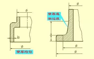 当铸件的壁厚不均匀一致时,铸件在浇铸后,因各处金属冷却速度不同,将产生裂纹和缩孔现象。因此,铸件的壁厚应尽量均匀,见上图;当必须采用不同壁厚连接时,应采用逐渐过渡的方式,见上图。铸件的壁厚尺寸一般采用直接注出。