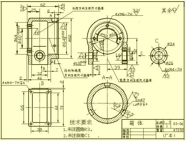 一般来说,这类零件的形状、结构比前面三类零件复杂,而且加工位置的变化更多。这类零件一般有阀体、泵体、减速器箱体等零件。在选择主视图时,主要考虑工作位置和形状特征。选用其它视图时,应根据实际情况采用适当的剖视、断面、局部视图和斜视图等多种辅助视图,以清晰地表达零件的内外结构。