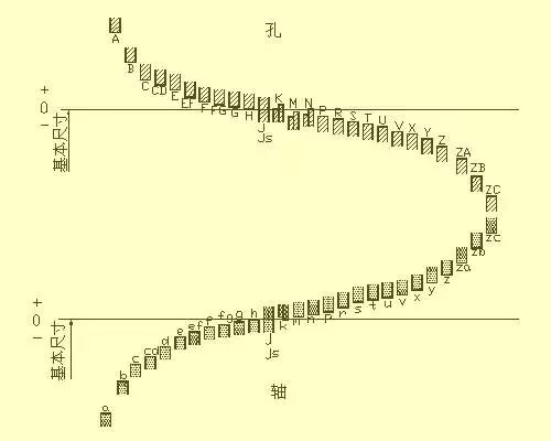 基本偏差是指在标准的极限与配合中,确定公差带相对零线位置的上偏差或下偏差,一般指靠近零线的那个偏差。当公差带在零线的上方时,基本偏差为下偏差;反之,则为上偏差。基本偏差共有28个,代号用拉丁字母表示,大写为孔,小写为轴。从基本偏差系列图中可以看出:孔的基本偏差A~H和轴的基本偏差k~zc为下偏差