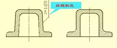 用铸造的方法制造零件毛坯时,为了便于在砂型中取出模样,一般沿模样拔模方向作成约1∶20的斜度,叫做拔模斜度。因此在铸件上也有相应的拔模斜度,这种斜度在图上可以不予标注,也不一定画出,如下图所示;必要时,可以在技术要求中用文字说明。